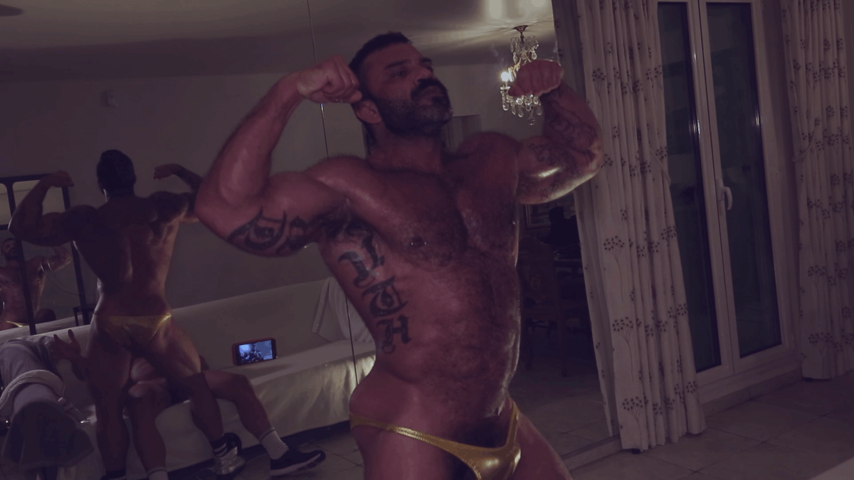 You are stunningly beautiful here. Dark, hairy, muscular – my masculine muscleman ideal. I love the way those gold trunks fit your hot fuckin’ muscle butt. Clamp my hog nips and fuck me.